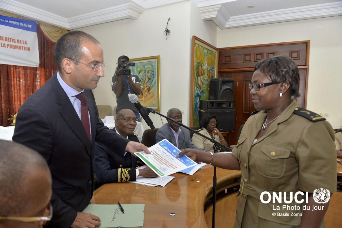 UNOCI organizes discussions with local government officials, dignitaries and elected representatives in Mé Region: A participant receiving her certificate (Adzopé, April 2016)