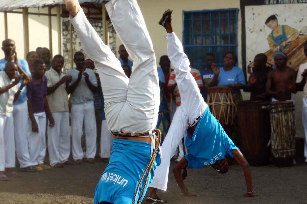 Ginga, cadera, tres taladji, auxilio, esquiva base, ... forty children practice together the steps of capoeira under the supervision of Dieudonné and Rafael, capoeira instructors and UN Volunteers in charge of the ‘’Capoeira…