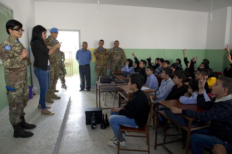 UNIFIL’s MCOU team explaining the Blue Line to the children of the Jibayl Al Butm school.