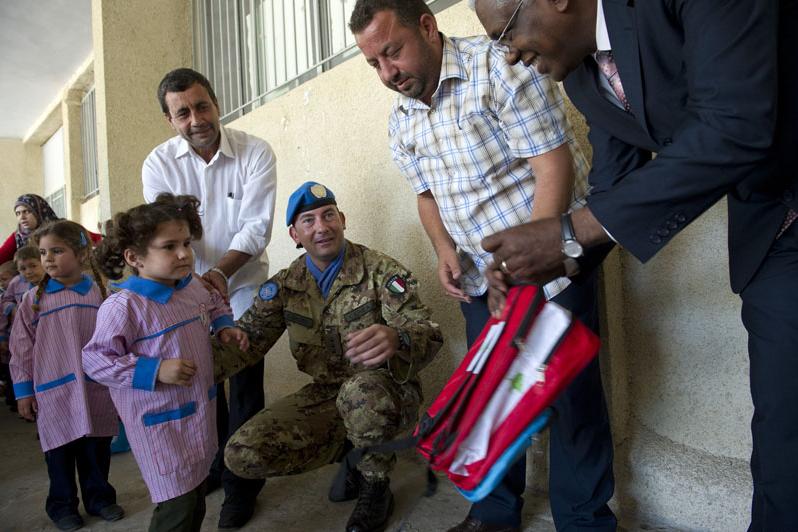 Albagir Adam, Chief of Civil Affairs handing out a school bag at Naqoura School, 05 November 2012