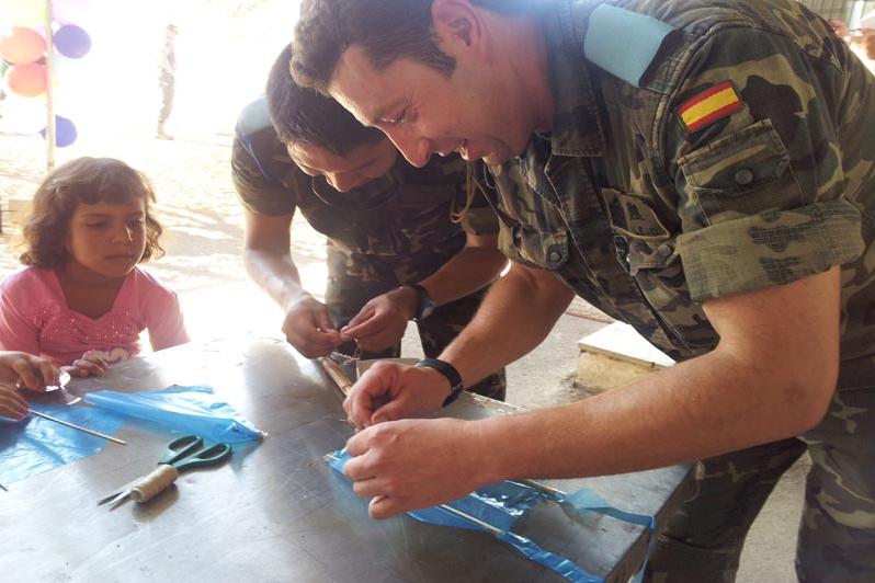 UNIFIL Spanish peacekeepers assisting the children in assembling a kite in Ein Arab