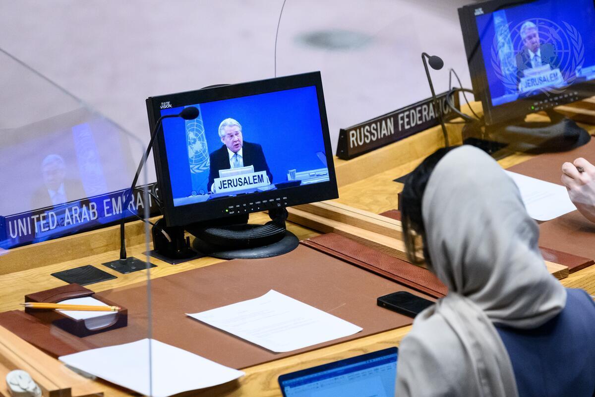 [On screen] UN Special Coordinator for the Middle East Peace Process, Tor Wennesland, briefs the Security Council on the Situatio in the Middle East including the Palestinian Question (19 January 2022 - UN Photo/Loey Felipe)