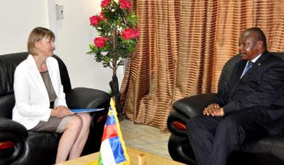 Avec le Deuxième Vice-premier ministre, auquel elle a transmis les félicitations du Secrétaire général de l'ONU, Ban Ki-moon, pour la formation du Gouvernement d'union nationale en République Centrafricaine, conformément aux accords signés à Libreville le 11 janvier 2013, Mme Kaarina Immonen a passé en revue les priorités et défis actuels de la RCA, au nombre desquels la réponse humanitaire aux populations en attente d'assistance, notamment dans les zones occupées ».